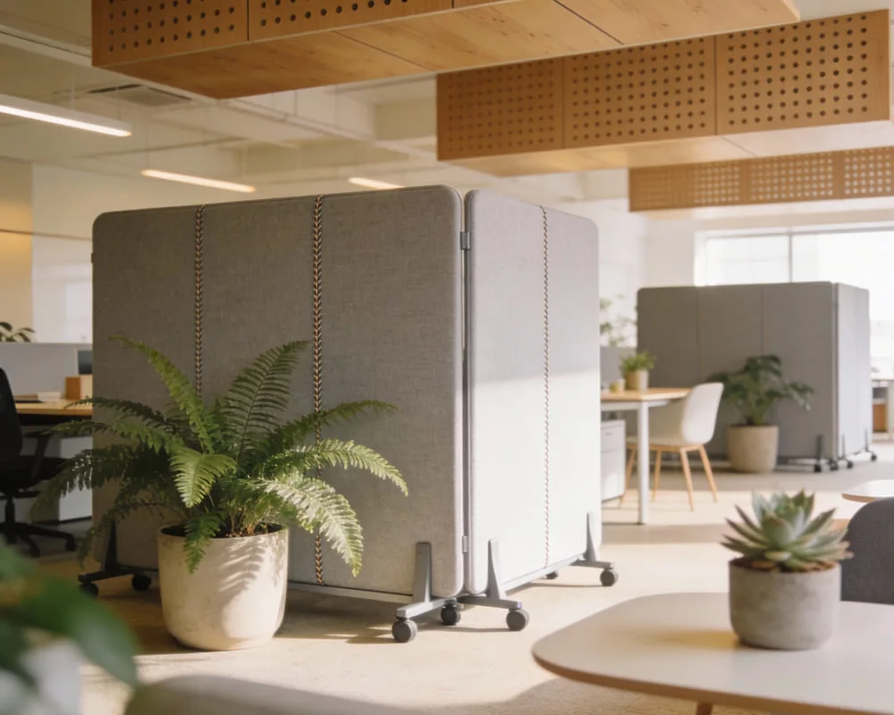• Biombos de oficina con tejidos o paneles inspirados en Cloud Dancer.